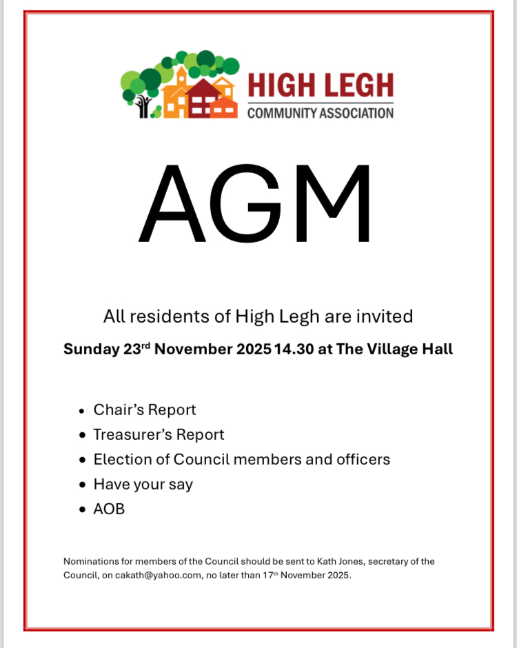 Sunday November 23rd 2025. 2.30 – 3.30 HIGH LEGH VILLAGE HALL